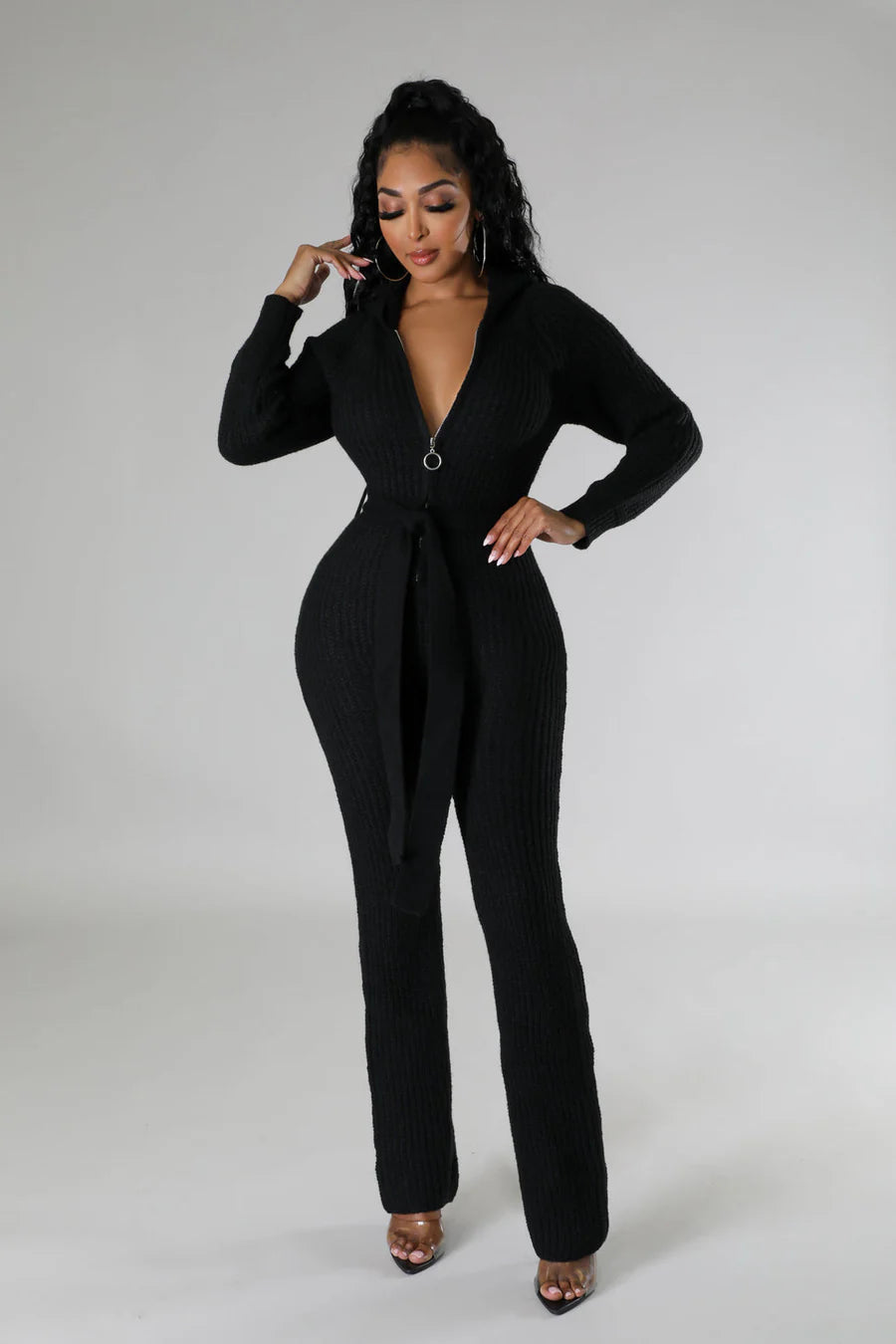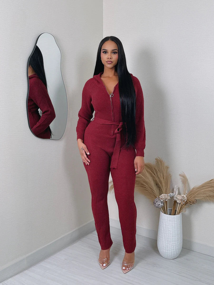 Stretchy, Long sleeved, knitted jumpsuit with a zipper detail and a hood.